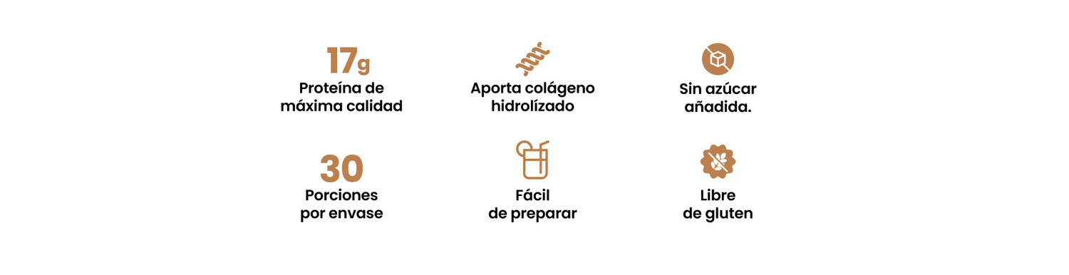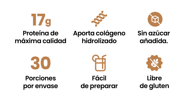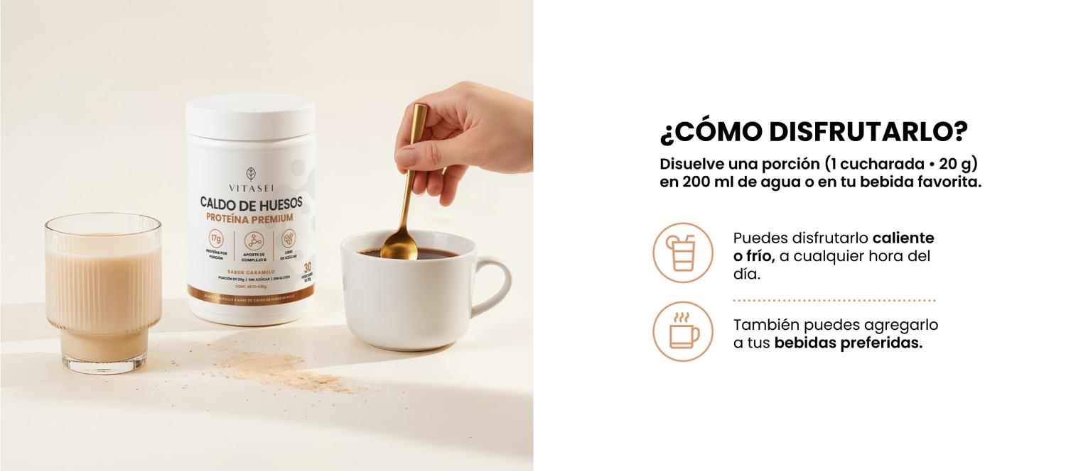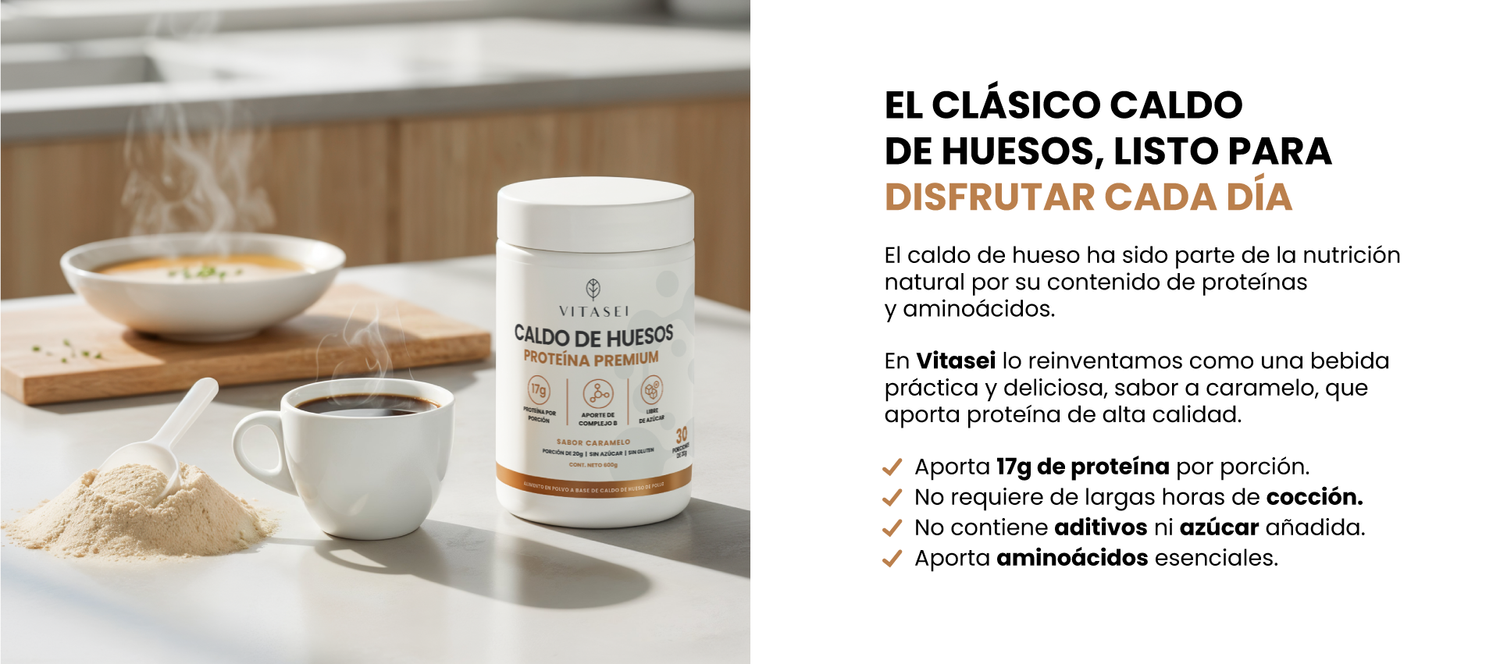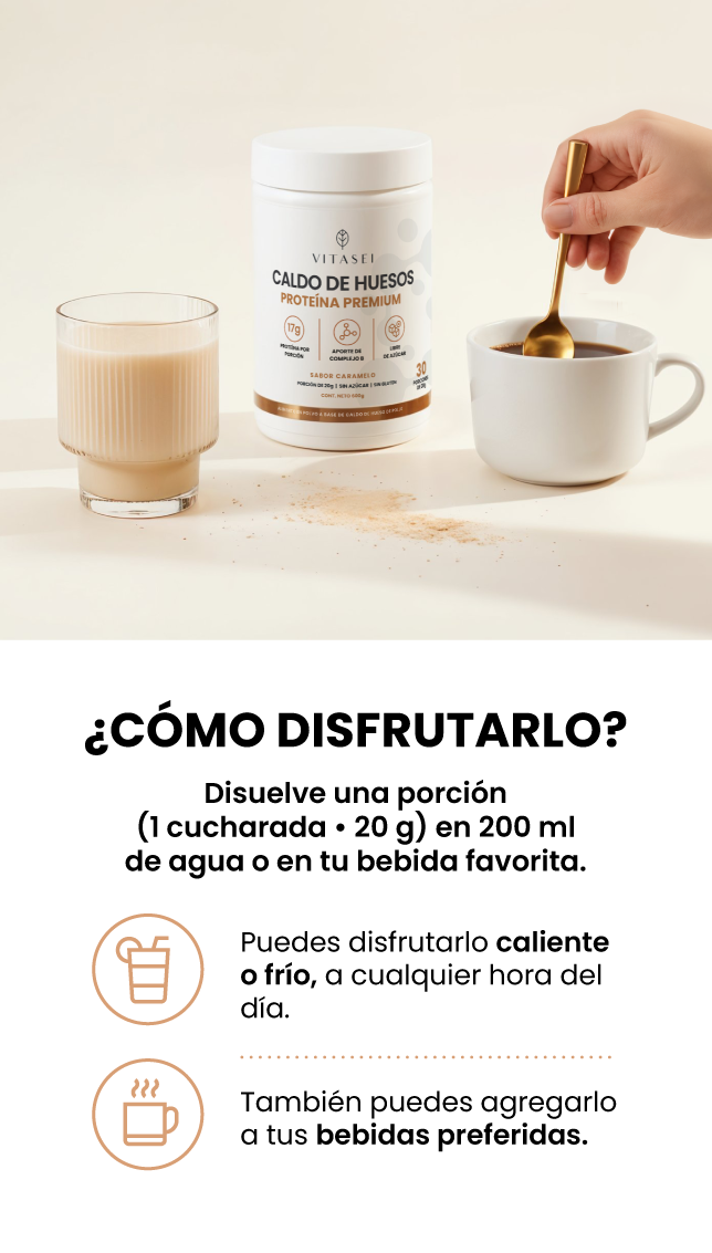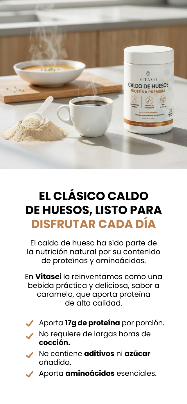 Es una bebida en polvo hecha con caldo de huesos de pollo, colágeno, vitaminas y antioxidantes naturales. Te ofrece todo lo que aporta un caldo tradicional, pero sin horas de cocción: solo mezclas y disfrutas.