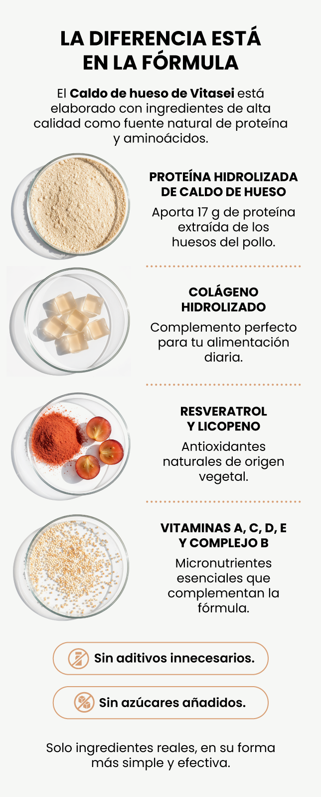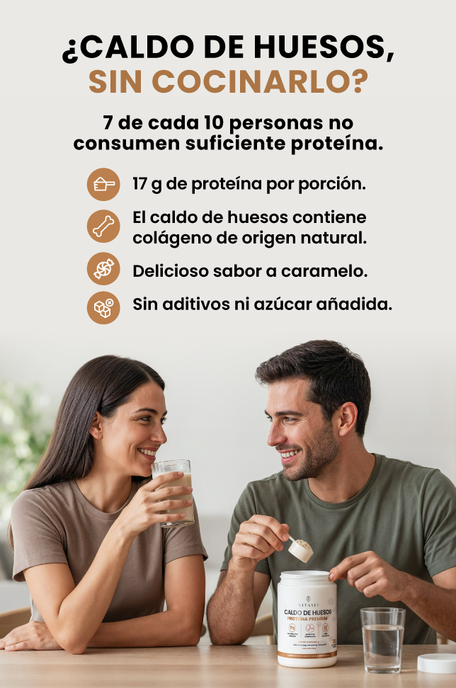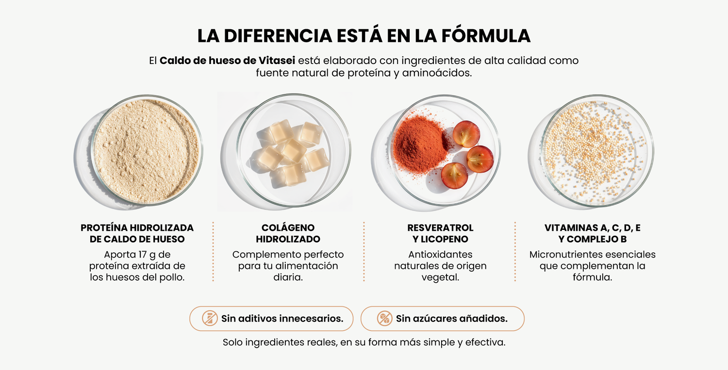 Está elaborado a base de caldo de hueso real, enriquecido con colágeno hidrolizado, vitaminas y antioxidantes naturales. Es una fórmula completa, sin azúcar añadida ni aditivos innecesarios.
