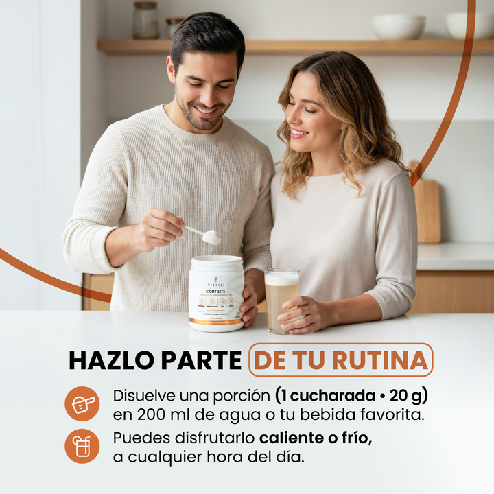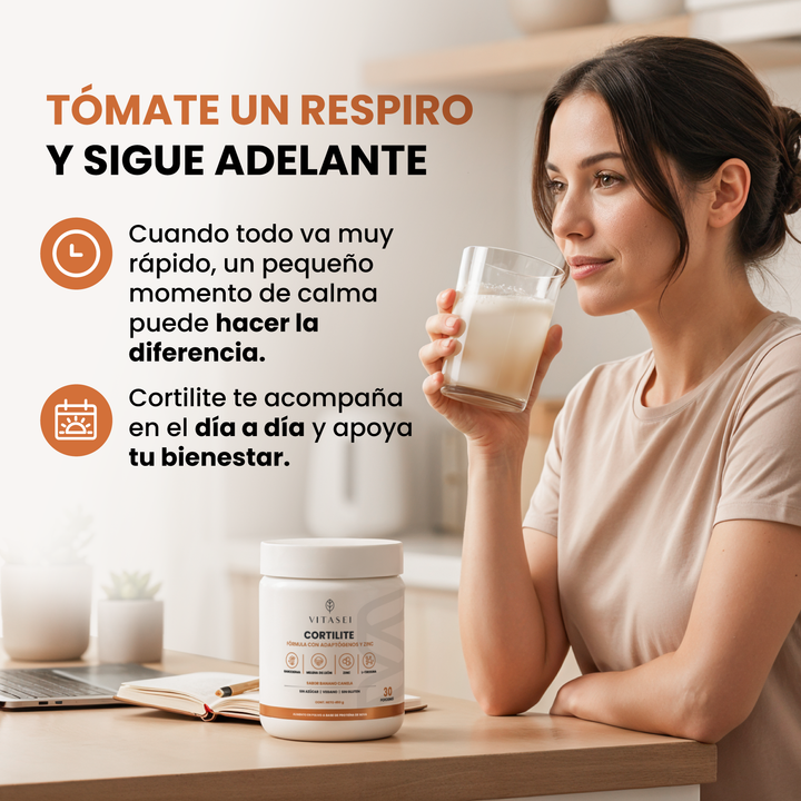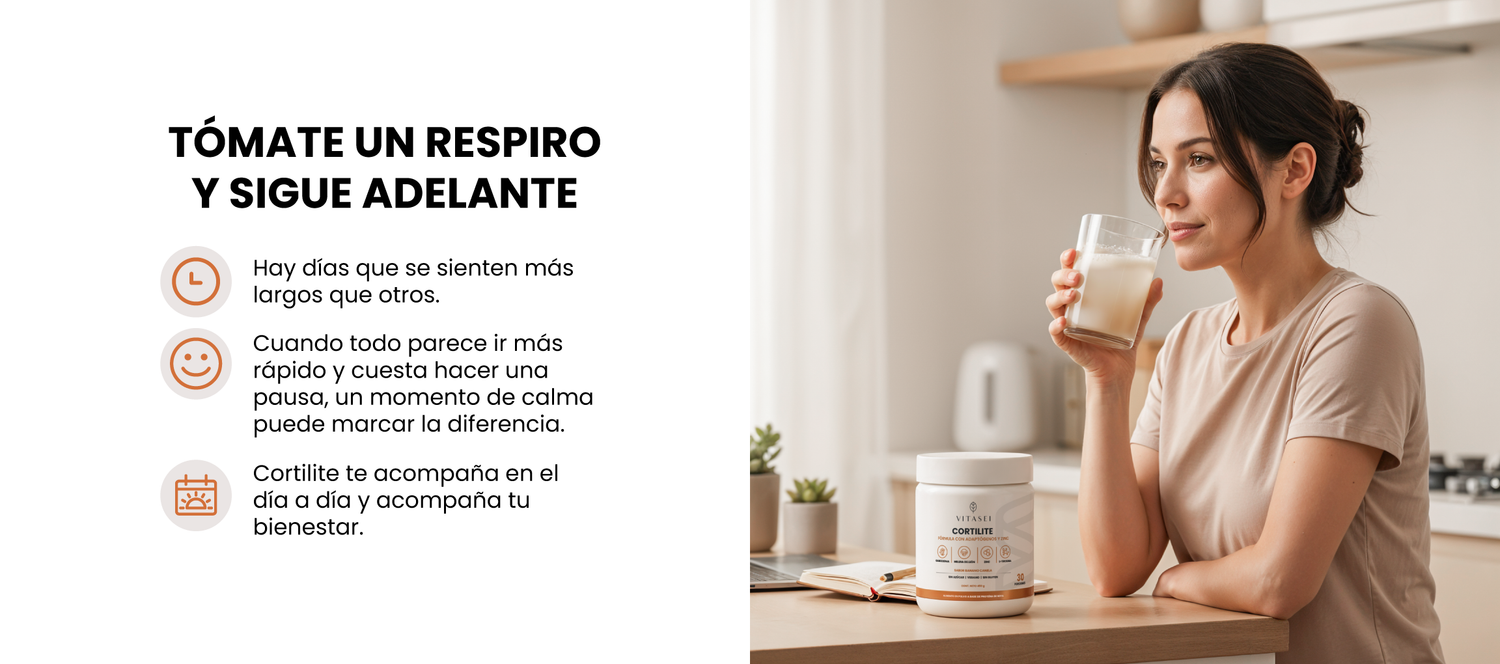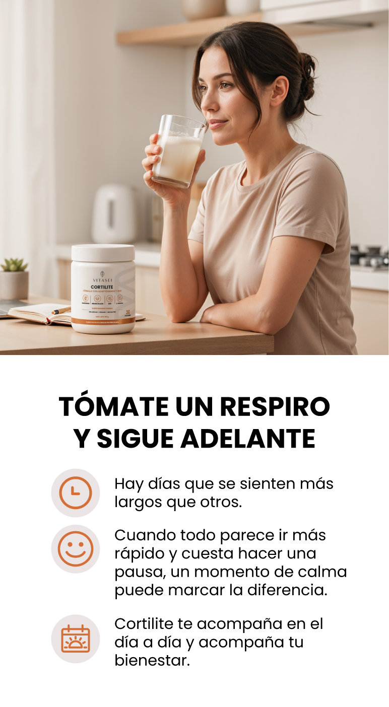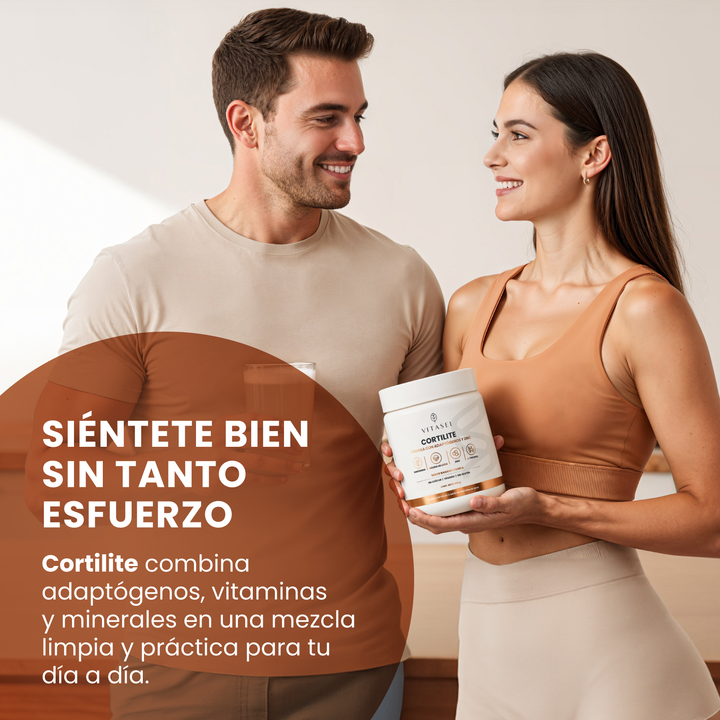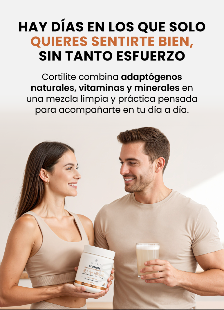 Cortilite es una mezcla en polvo con adaptógenos, vitaminas y extractos naturales, diseñada para acompañarte en los días de mayor exigencia y ayudarte a mantener tu bienestar diario.