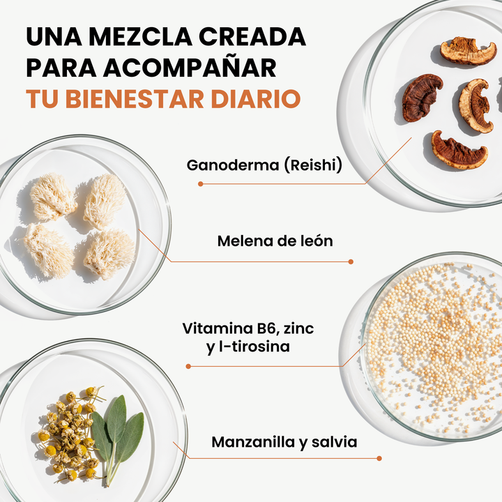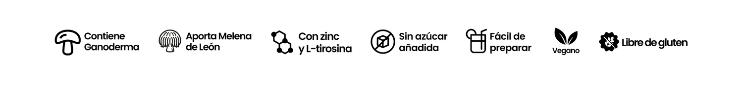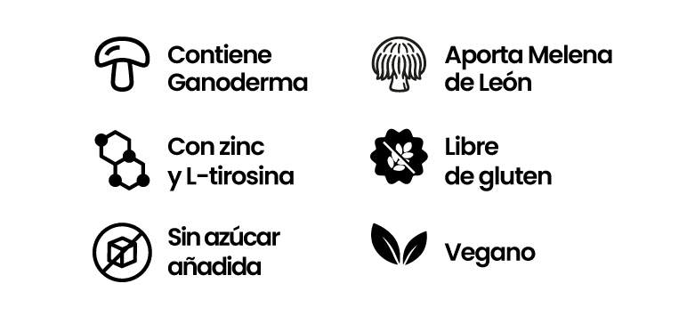 - Contiene Ganoderma (Reishi) y Melena de león, conocidos por sus beneficios.