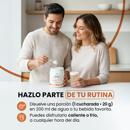 Cortilite es una fórmula con adaptógenos como Ganoderma y Melena de león, vitaminas y zinc, creada para acompañarte en tu rutina del día a día. Con un sabor natural a banano y canela. Práctica, limpia y lista para disfrutar en segundos.