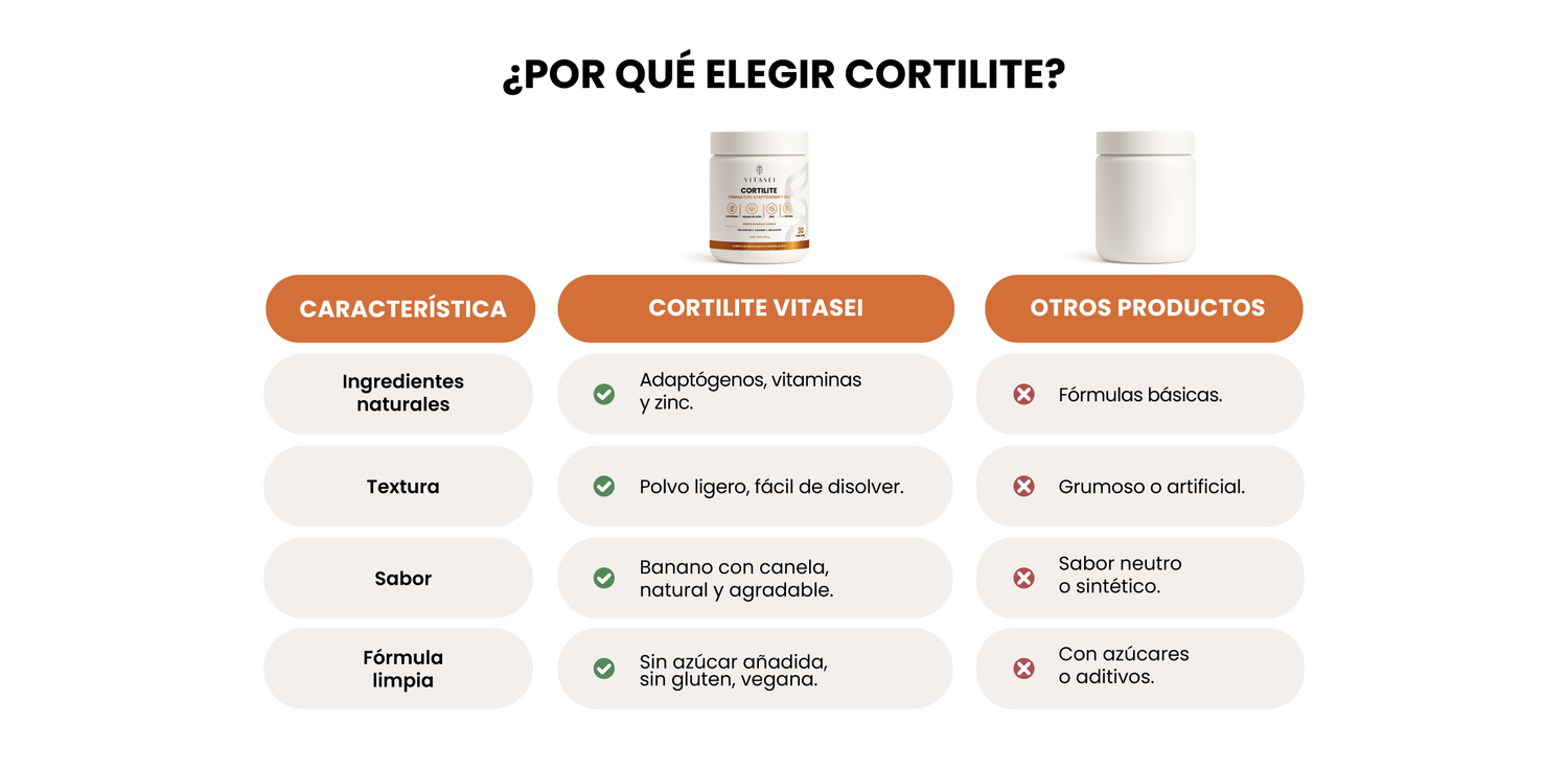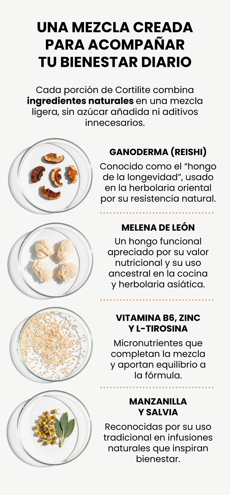 Cortilite te acompaña con una mezcla natural que combina adaptógenos, vitaminas y extractos naturales.