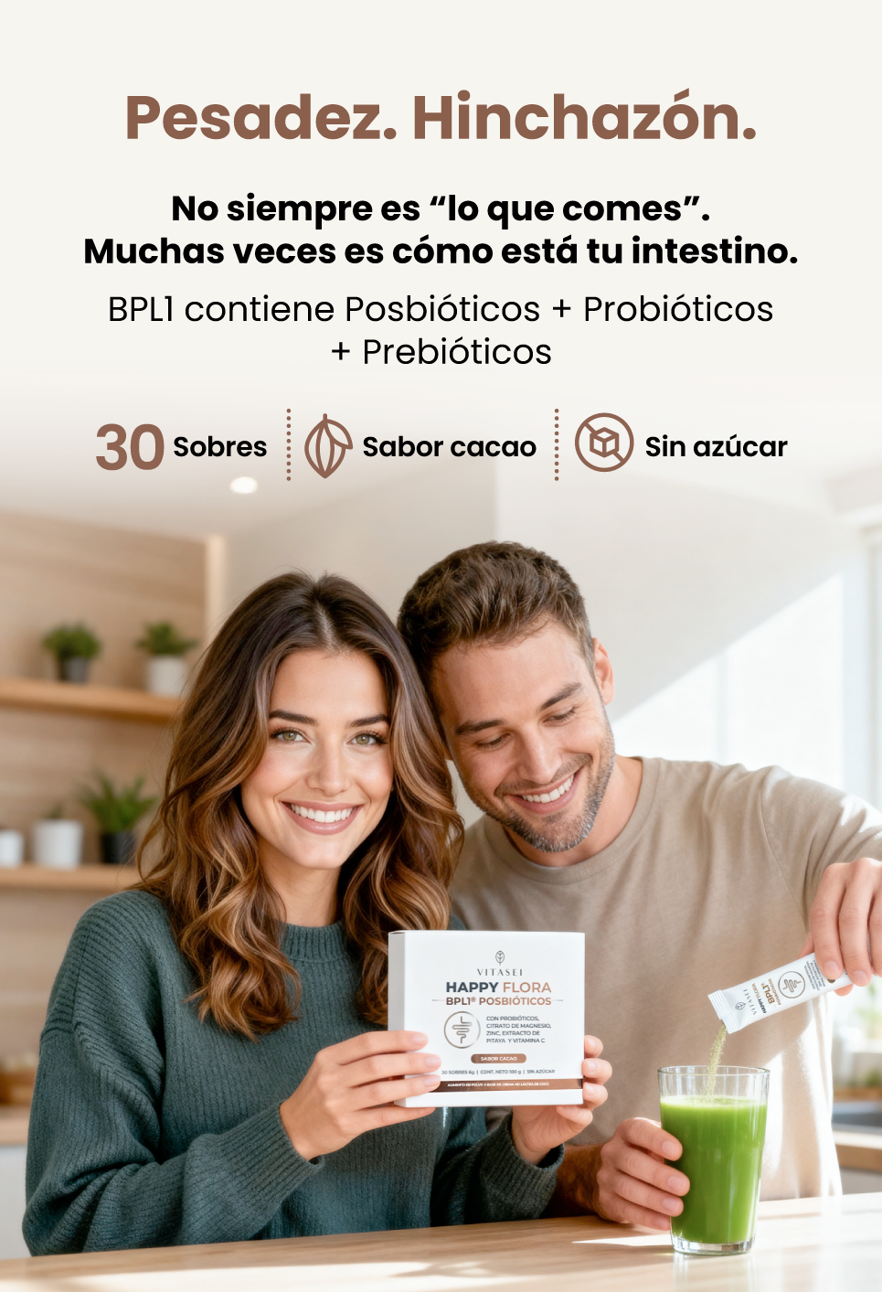 Happy Flora BPL1 combina posbióticos con probióticos, magnesio, zinc, vitamina C y extracto de pitaya en un delicioso polvo sabor cacao, diseñado para integrarse fácilmente a tu rutina de bienestar diario.