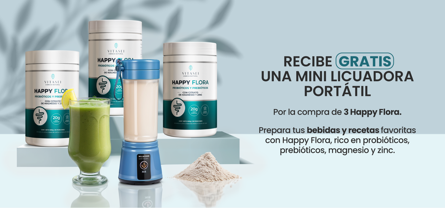 Lleva GRATIS una mini licuadora portable por la compra de 3 Happy Flora