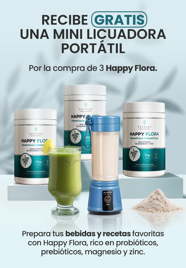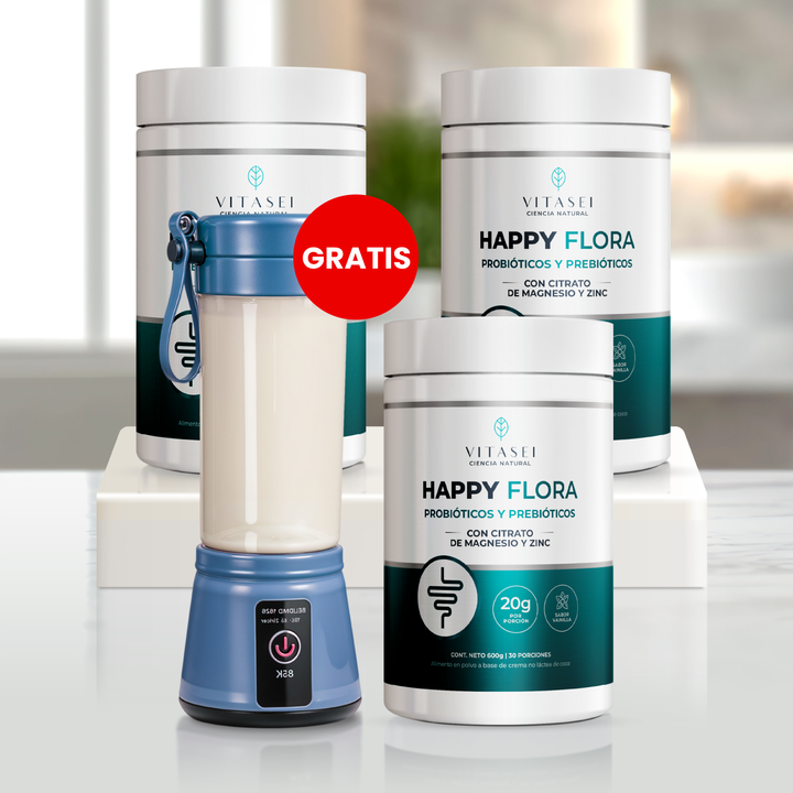 🎁 Además, recibe una MINI LICUADORA PORTATIL de regalo para preparar tus bebidas y recetas favoritas con HappyFlora.