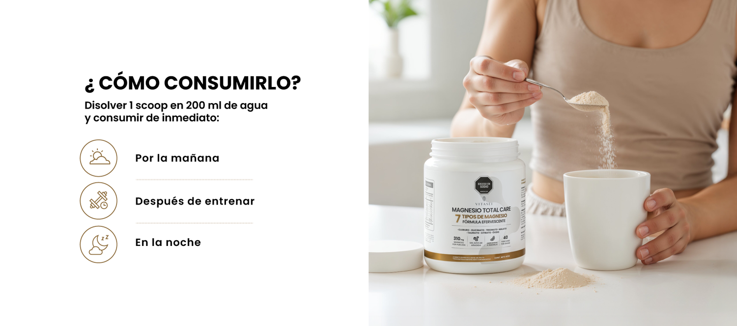 Disuelve una porción en un vaso con agua y deja que la efervescencia haga su magia. Puedes tomarlo en cualquier momento del día, aunque muchas personas lo prefieren:
