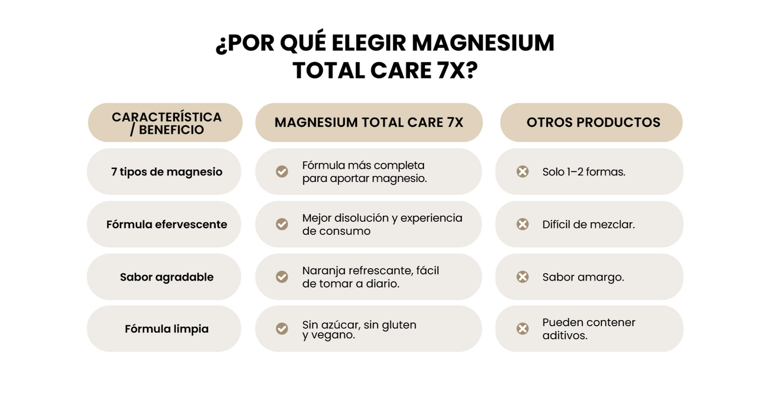 Magnesio Total Care contiene 7 tipos de magnesio para mantenerte en equilibrio cada día.