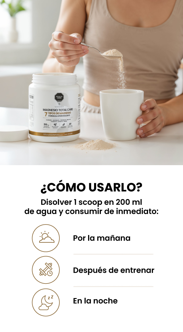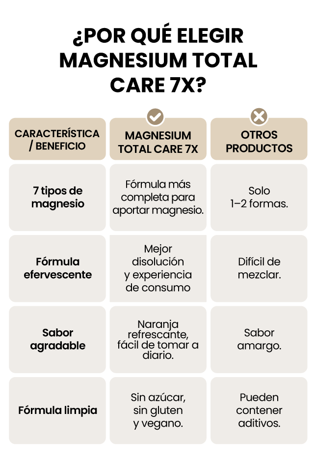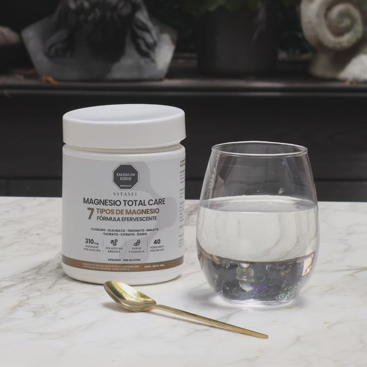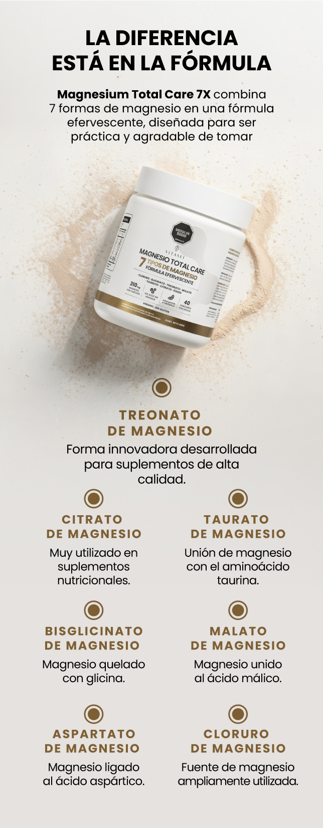 Magnesio Total Care combina 7 tipos de magnesio en una innovadora fórmula efervescente, creada para acompañarte en tu día a día y apoyar múltiples funciones del cuerpo.