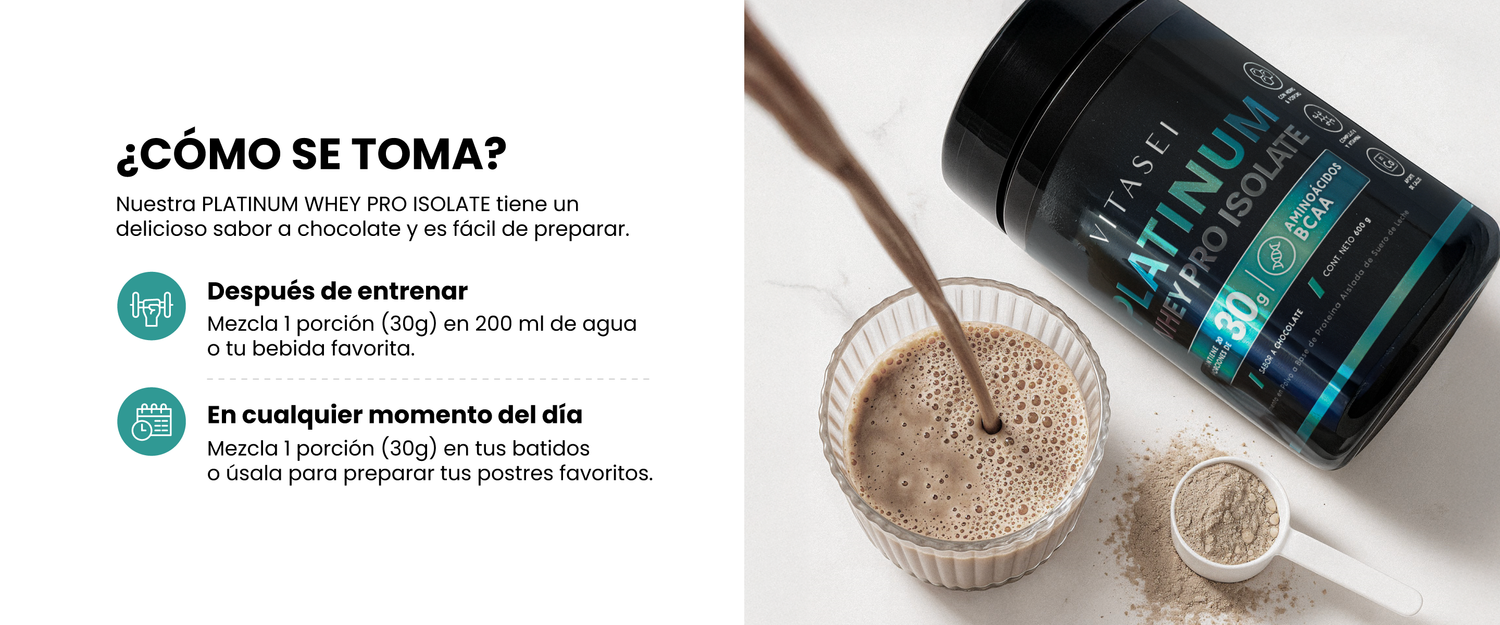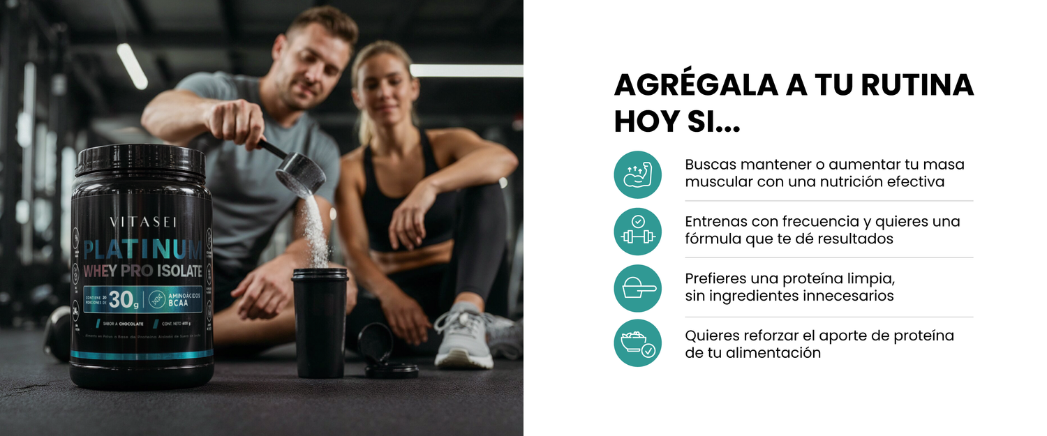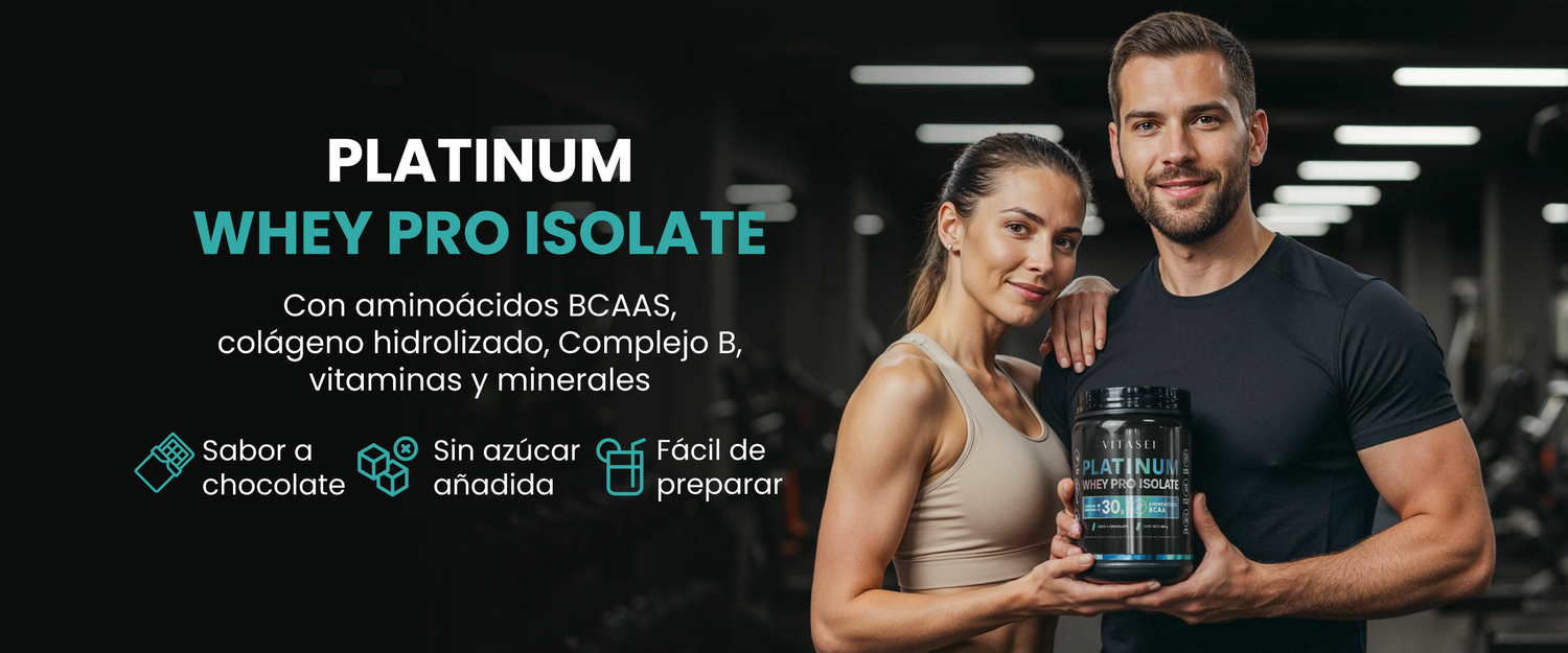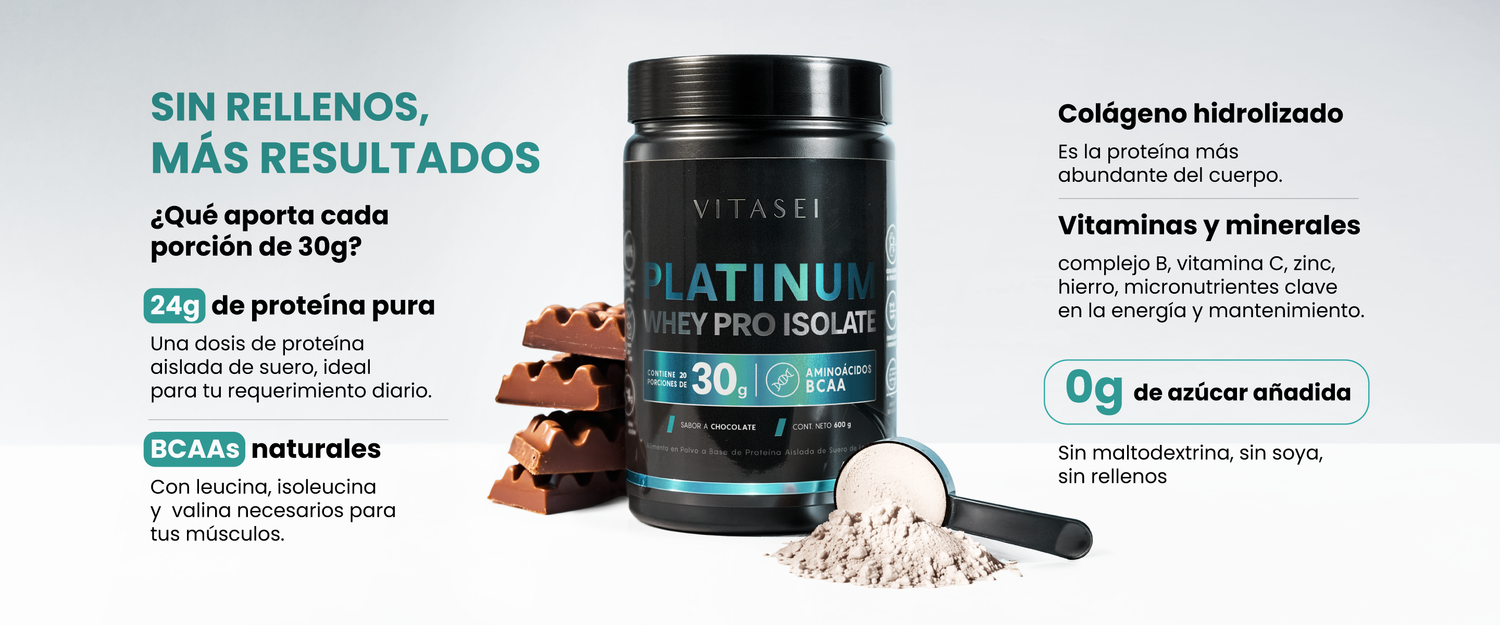 Platinum Whey Pro Isolate combina proteína aislada de suero, colágeno hidrolizado, BCAAs naturales y vitaminas esenciales.
