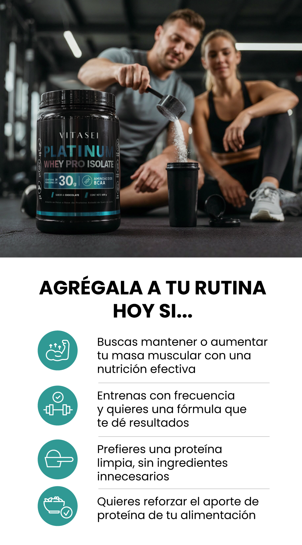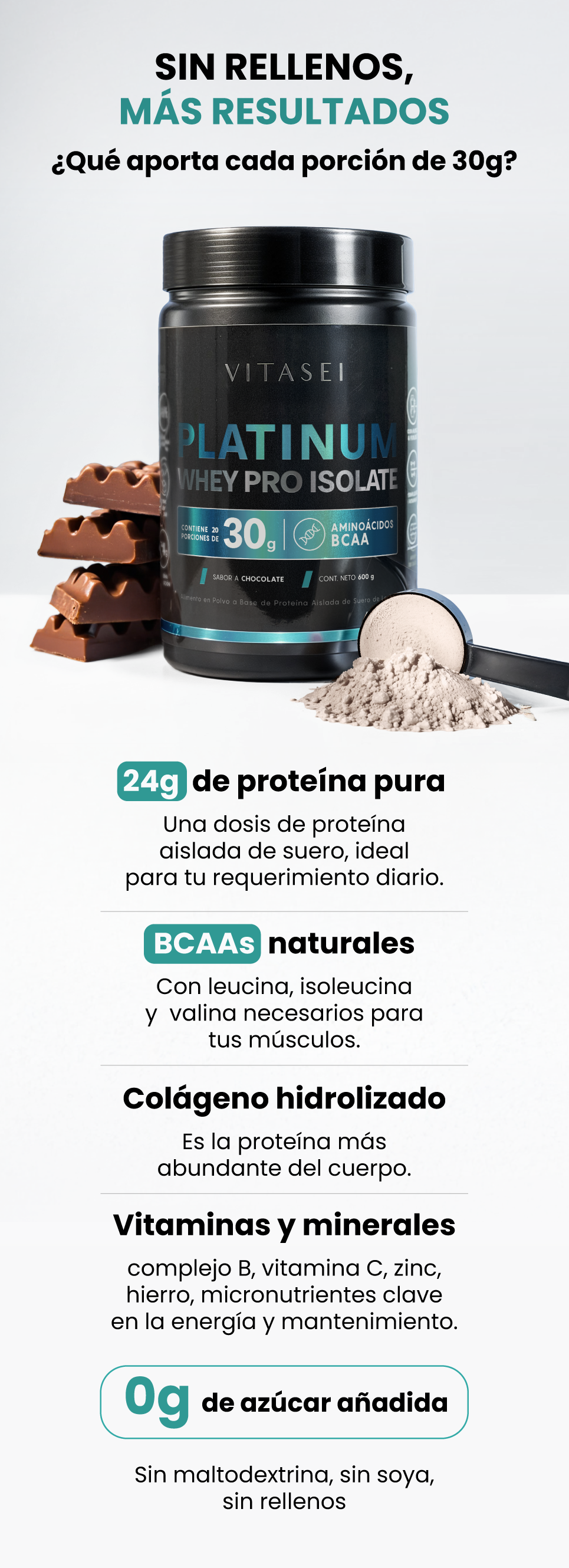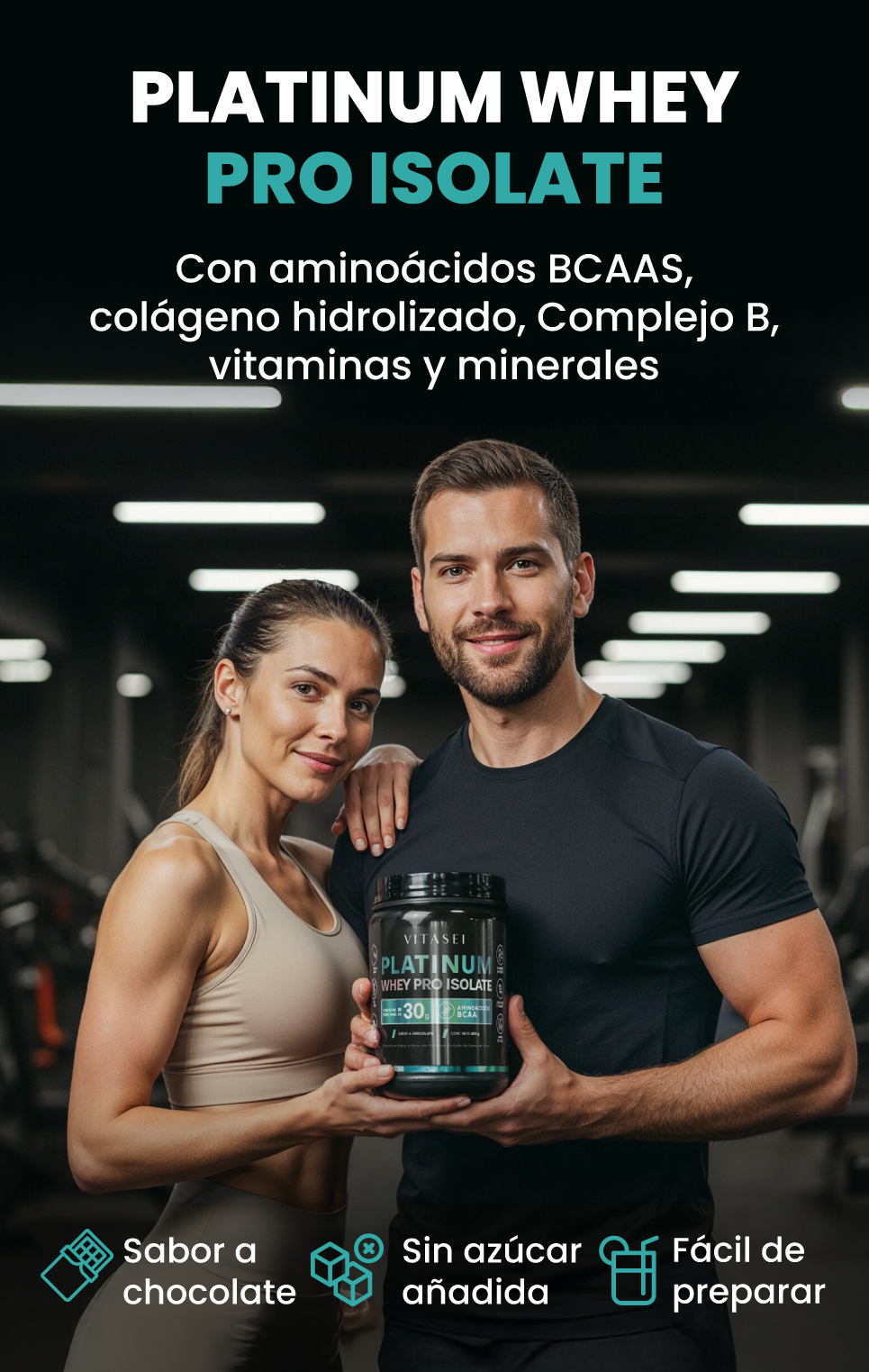 Platinum Whey Pro Isolate combina proteína aislada de suero, colágeno hidrolizado, BCAAs naturales y vitaminas esenciales.